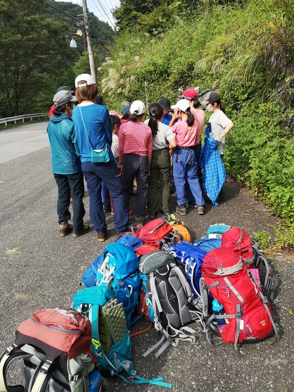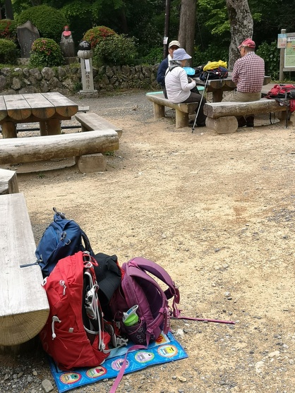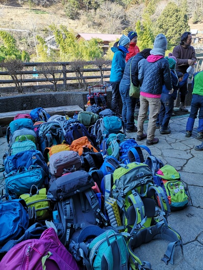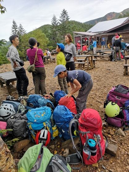 大人たちのザック置き場になっている同じ広場の一隅では、私たち親子山学校の親子も同じようにミーティングをやっていました。言わずもがなですが、せっかくなのでその時の親子山学校メンバーのザックが置かれた写真も見ていただきます。