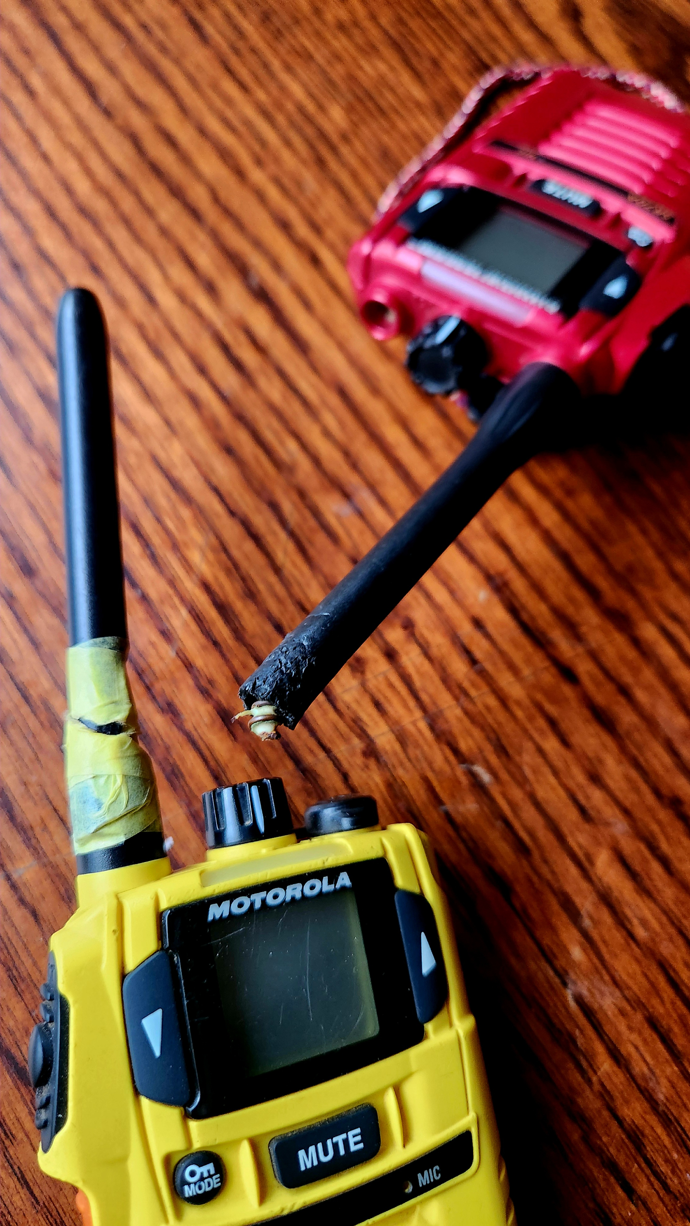 それはトランシーバーの本体から飛び出たアンテナの損傷でした。親子山学校が購入し使ってきた三世代のトランシーバーを見比べて下さい。