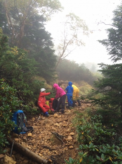風と濃霧の山頂を経て、赤岩の頭から岩場を巻き、ようやく樹林帯に逃げ込んだところで一休みすることにした。そのうち男がやって来た。