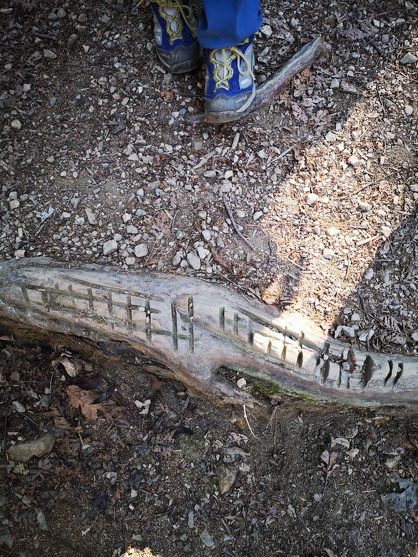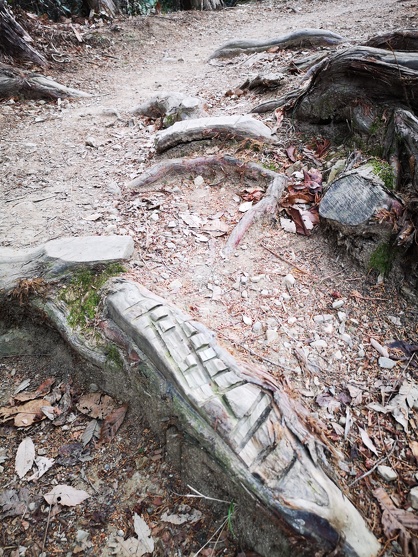 その浮き出た木の根に、ノコギリか何かで付けられた、靴底の凹凸のようなギザギザの切り込み跡があることに気づきました。明らかに人為的な造作行為です。