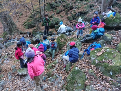 クリスマスが近づく12月23日早朝、親子山学校の15名の子どもたちが、中央本線鳥沢駅前に保護者と連れだって集まっていました。15名の子どもたちは、まだ学校に上がる前の年長さんから小学5年生まで。男子7名、女子8名という顔ぶれです。いつもはキッズクラスで毎月の低山トレッキングに参加しているこの子たちが、来年度のジュニアクラス入りをかけた「トライアル」に挑みました。登った山は倉岳山(990m・山梨県大月市)。鳥沢駅からスタートし、小篠集落の登山口から山道に入って、高畑山分岐、穴路峠を経て倉岳山。復路は立野峠へ下って月夜野沢の沢すじを歩き、最後は梁川駅までのおよそ10キロメートルに及ぶ変化に富んだコースです。
