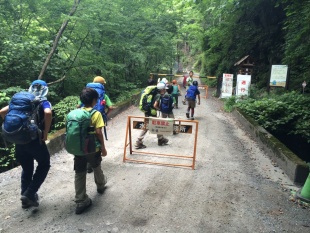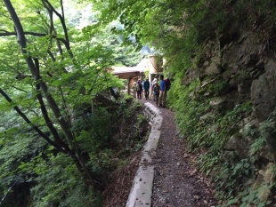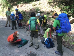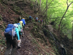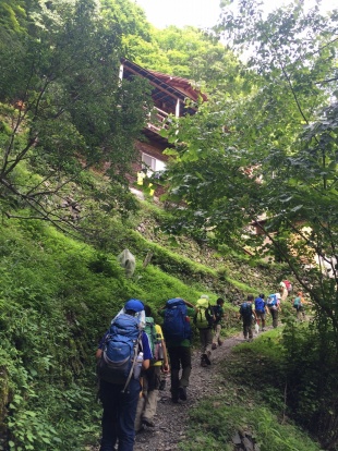 三条の湯について一休みしてから、リーダーたちは翌日の早朝にあるく登山道の下見に出かけます。山小屋からの歩き出しすぐから、片側が谷に切れ落ちた細い道が続くので、念のため見ておく必要があります。その下見を終えてから山小屋に戻り、ようやくリーダーたちも小屋のお風呂につかります。