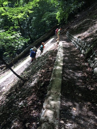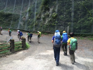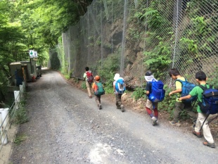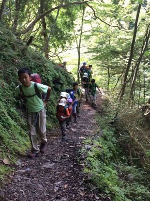 やがて山道が終わり、林道に出て、さらに樹林帯の中を歩く段になって、2年生のR君の歩きがどんどん遅くなってきました。体力的に限界に近づいていたのでしょう。今日だけで15キロ近い山道を歩いています。
