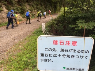 奥多摩小屋の前で昼食になり、水場まで子どもたちも午後の水補給に下って行きました。お昼は時間を使ってしまったので、七ツ石山はさけて石尾根からブナ坂に入り、ずんずん下っていきます。