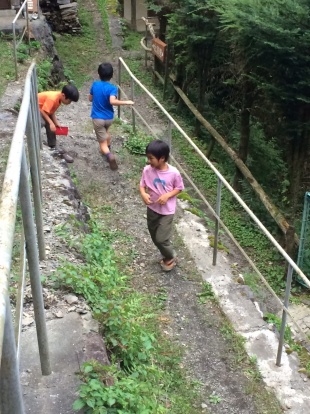 16時はとっくに回って、16時20分過ぎ。集落にそった舗装路の坂道を急いで下っていくと、今度はやはり2年生のCちゃんがしくしくと泣き始めました。そばにいた私もびっくりして「どうした?もう少しでバス停だよ」。紅一点の参加で、ここまで男の子たちに混じっても健気に明るくがんばってきたCちゃんも、限界を迎えていたのでしょう。泣きながらもCちゃんは歩き続けました。