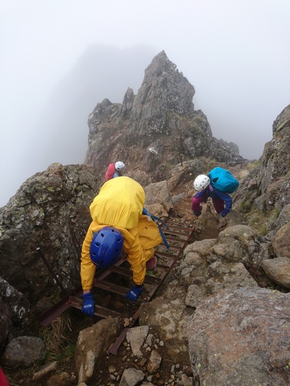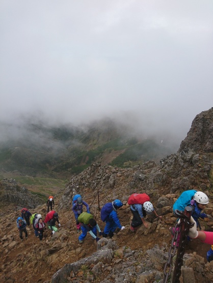 親子山学校のジュニアクラスの親子による、八ヶ岳の最高峰・赤岳(2899m)への登山を、6月24日(土)から25日(日)の1泊2日で実施しました。山頂アタックの二日目は雨の予報でしたが、雨の止んだ午前中の間隙を縫って、赤岳鉱泉から山頂まで登り2時間45分(休憩含む)の好タイムで全員登頂を果たしました。参加したのは高学年の5年生、6年生の児童6名(男子3名、女子3名)と、その親御さん(ジュニアクラス専任リーダーを含む)たち総勢14名のパーティーです。(一部の写真は、クリックすると拡大表示できます)