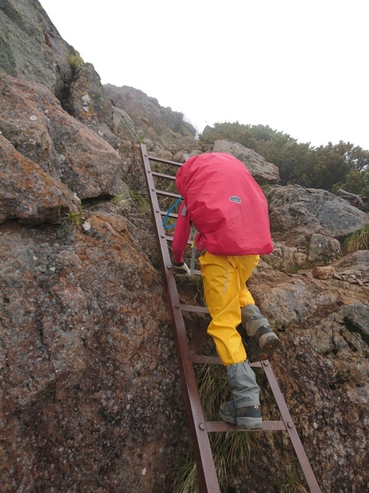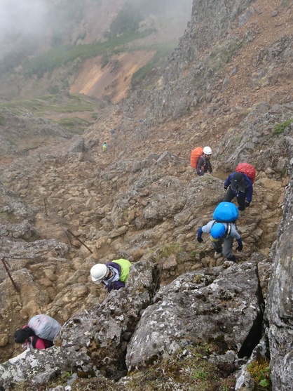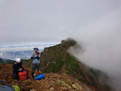 山小屋の屋根を叩く雨音で目が覚めました。5時過ぎ、表に出て様子を見ると雨脚はしだいに弱まっていました。風はほとんどなく気温も気圧も安定していたので、参加者全員に「雨でも行けるところまで行こう。進退は先々の状況で判断。朝食後、いつでも出発できる準備をしておくこと」と伝えて、6時45分赤岳鉱泉を出発しました。行者小屋前で完全に雨具を解いて、身軽な服装で文三郎尾根にとりつきました。それ以降は全員闘志あふれる力強い登りで、赤岳鉱泉を発ってから2時間45分後の9時30分に赤岳(2899m)の頂上に立ちました。30分の休憩後、同じルートで行者小屋まで降り、昼食をすませて南沢ルートで美濃戸口まで下山。6名の子どもたちは最後まで元気いっぱいで帰路につきました。