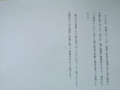 僕はまだ実現したい事は見つかっていないけど、もし見つかったら本能任せにせず理性と知能を使って実現させようと思います」