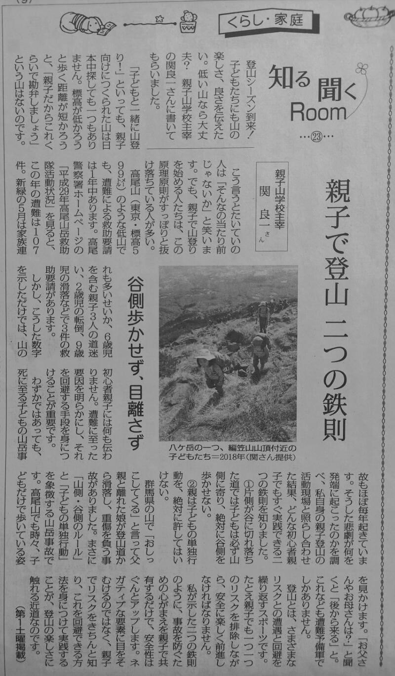 登山シーズンを迎えた5月4日の「しんぶん赤旗」(土曜日・くらし家庭面)に、親子登山をはじめる際に気をつけたいことを二点に絞って書いた原稿が掲載されました。これは親子山学校でもすべての親子メンバーが共...