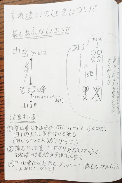 こうして計画書の段階から、登山の行程中で最も注意を必要する部分についても参加者全員が情報を共有して、現場でも落ち着いて対応できるように努めているわけです。