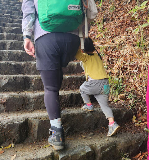 ★想像以上に大きな段差が多いルートでしたが、こんなに小さなこどもたちでも目標まで登り切ることができるんだなという感動がありました。私と息子だけでは絶対に達成できなかったことで、みんなで登るということの意味を改めて実感しました。普段の息子の様子を見ているかぎり、きっと途中で疲れたと座り込んでしまうだろうと腹をくくっていましたが、意外と淡々と歩いていて、サポートメンバーのみなさんの温かい声かけに後押しされながら、みんなと登っているという意識がしっかりとあって驚きました。(3歳児と参加したAさん)